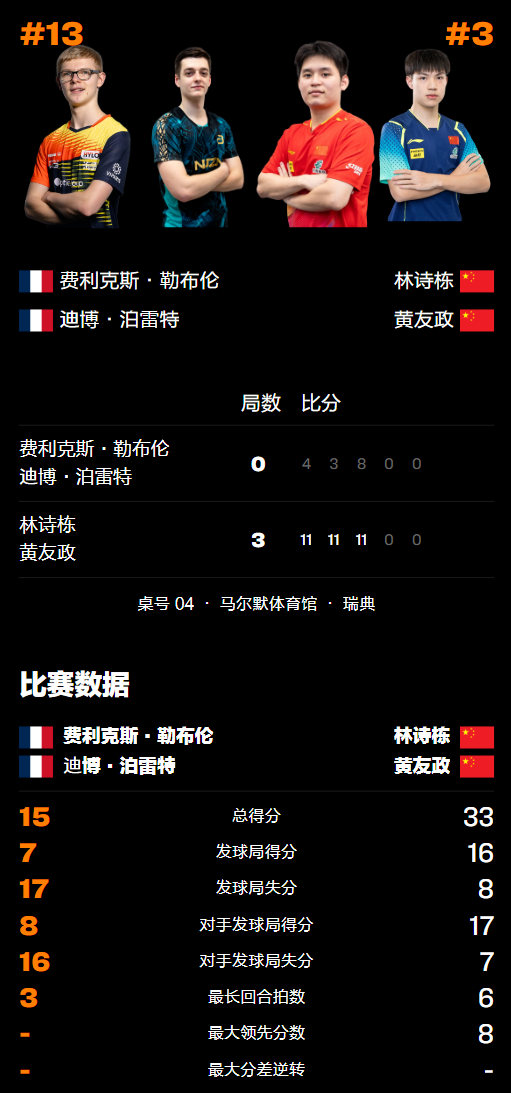 第三局法国选手背水一战打出了一些威胁,但关键时刻还是国乒组合的表现更加出彩,结果林诗栋/黄友政以11-8锁定胜利,由此而大比分零封小勒布伦/泊雷特晋级。